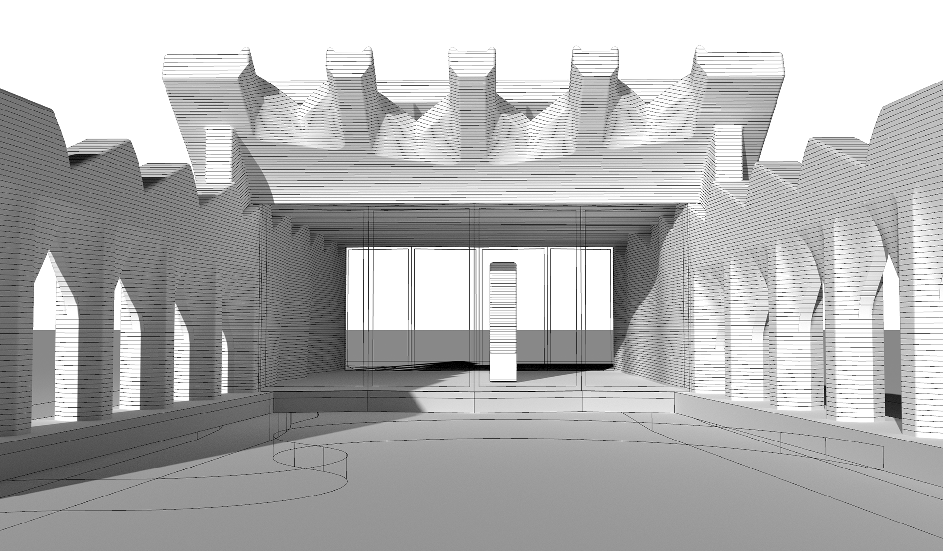We favoured an intellectual design process over a space-planning one: absorbed the notion of property lines into the house volume; proposed maximal walls within the print bed, with arcades permeable to nature and pedestrian comings and goings to semi-open gardens. Novel modes of interaction between neighboring homesteads are expected. Biodiverse iterations of the semi-open (sheltered) arcade courtyards are enabled.